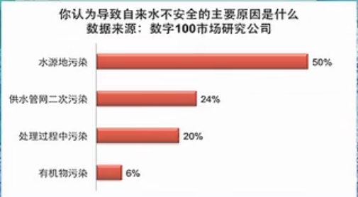 根據一項調查自來水主要污染的問題是什么?其中水源地污染占50%,供水管網二次污染和處理中的污染占44%。
