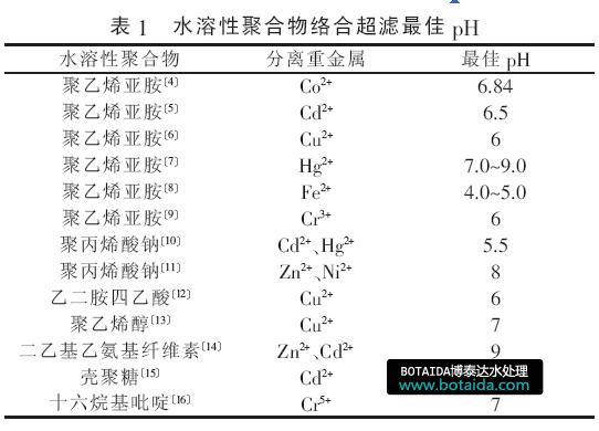 pH 是影響聚合物和目標金屬離子之間作用效果的主要因素之一?在酸性區域內,大量存在的H+在與聚合體的配位基結合上與金屬離子存在競爭,影響聚合物與金屬離子的絡合?隨著pH 的增大,溶液中的H+減少,對聚合物與金屬離子的絡合影響減小,在pH 增大到某個特定值前,金屬離子的截留率一般也會隨著上升, 相應的pH 即為最佳pH?表1總結了水溶性聚合物絡合超濾最佳pH?