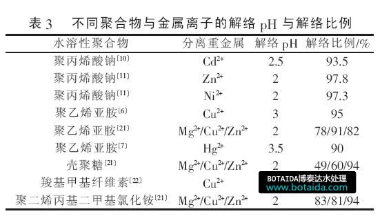 由表3 可知,使用酸化再生法時,解絡pH 一般在2~3?在選定解絡pH 后,解絡的效果受聚合物與金屬離子影響?而同一金屬離子與不同聚合物在同一pH 條件下的解絡效果差異也較大〔21-22〕?