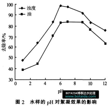 試驗采取方法2 的投加順序, 通過改變水樣的pH 來考察其對絮凝效果的影響,結果見圖2?