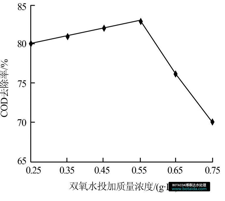 在pH=3.0,鐵炭總質量濃度20 g/L,反應時間40 min,MnO2投加質量濃度為2.50 g/L,鐵炭比3∶1條件下,分別加入0.25、0.35、0.45、0.55、0.65、0.75 g/L H2O2進行實驗,考察H2O2對微電解處理廢水體系的催化作用,結果如圖3所示。