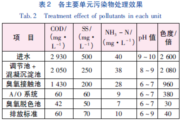 本工程經過近2 個月的調試運行后,出水水質穩定,COD 總去除率為98.6%,達到設計要求。各單元的處理效果見表2。