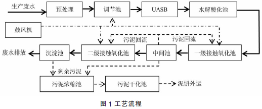 首先通過預處理調節廢水的pH 值、去除大顆粒SS,然后通過曝氣調節池調節水量水質,調節均勻的廢水通過水泵提入厭氧反應階段,在厭氧菌的作用下,將難以降解的大分子有機物分解為小分子有機物,提高廢水的可生化性,通過厭氧段的降解,具有良好可生化性的廢水進入接觸氧化階段,通過好氧菌的好氧硝化降解,將廢水中的污染物質轉化為無機物,完成廢水的處理。其工藝流程見圖1。