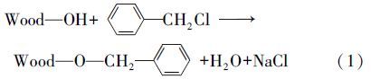 參照文獻(王東華等,2000)方法,在帶有攪拌機、溫度計和回流裝置的250 mL三口燒瓶中,加入20.0 g脫脂杉木粉和10% NaOH水溶液80~120 mL,攪拌均勻后讓其潤脹 30 min,然后加入 80~120 mL氯化芐和80 mL甲苯,攪拌下于110 ℃ 油浴中加熱反應到設定時間,冷卻并加入少量水,抽濾,分別用50 mL 50%乙醇洗滌兩次,100 mL水洗滌兩次,再用50 mL 95%乙醇洗滌兩次,抽干,在60 ℃下干燥至恒重,得芐基化杉木粉,簡稱“芐基化木粉”,轉入干燥器中,并計算增重百分率(WPG).木粉芐基化改性的化學反應式如下:
