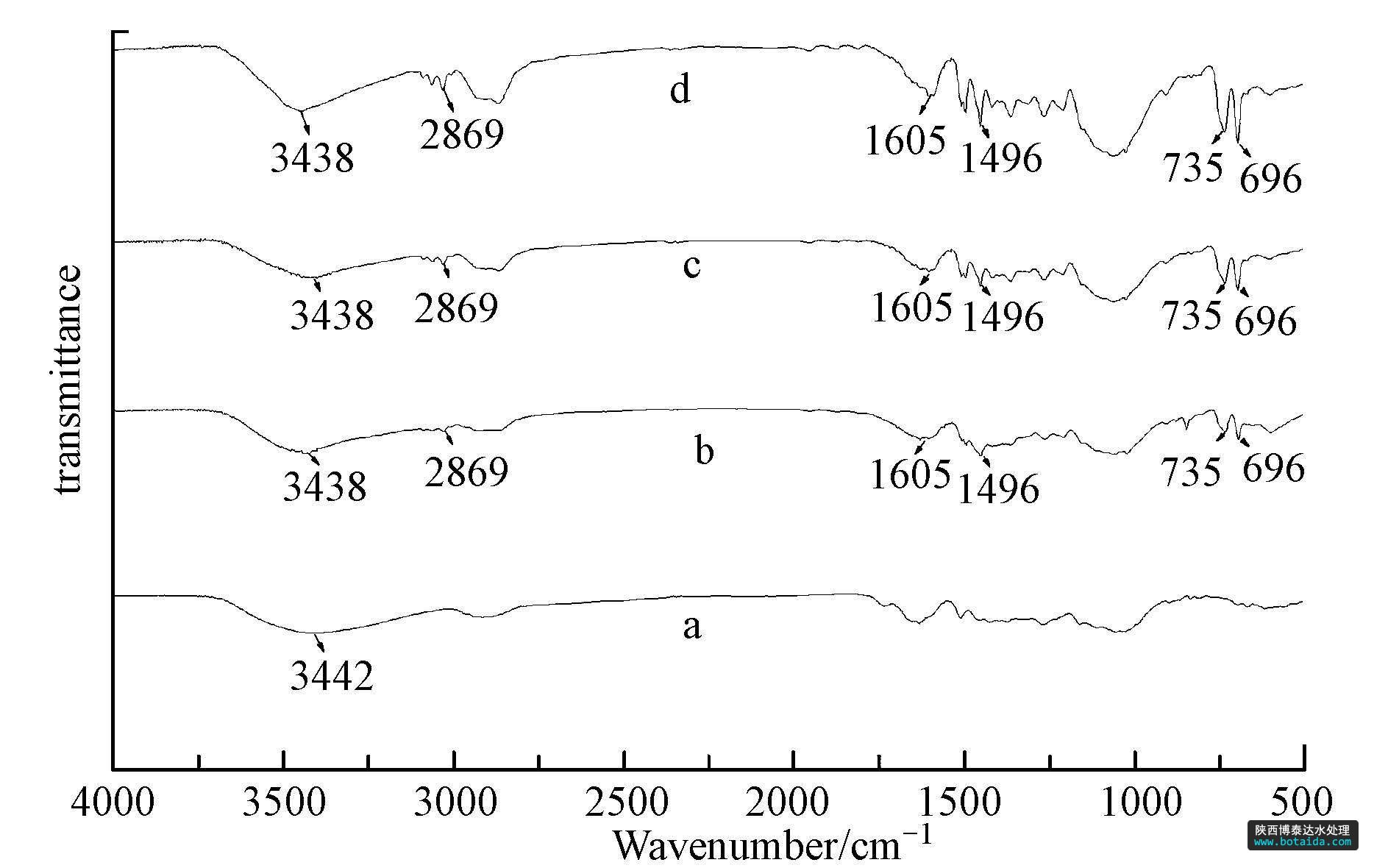 分析 采用Nicolet Avatar-330紅外光譜儀對脫脂木粉、芐基化木粉、多微孔芐基化木粉和吸附后的多微孔芐基化木粉進行了表征(圖 1).對比原木粉(圖 1a)和芐基化木粉(圖 1b)的紅外光譜圖發現,原木粉經芐基化改性后,羥基振動吸收峰由3442 cm-1移向3438 cm-1,在1605 cm-1、1496 cm-1處的兩重峰及735 cm-1、696 cm-1處的強吸收峰均顯示單取代苯環的特征吸收.另外,2868 cm-1處出現的振動吸收峰表明了木材中的部分羥基已經被芐基所取代.對比芐基化木粉(圖 1b)和多微孔芐基化木粉(圖 1c)的紅外光譜圖發現,圖譜形態變化不大,無新的官能團吸收峰出現,表明芐基化木粉經水熱處理后,木粉的化學組成沒有發生明顯變化.對比多微孔芐基化木粉(圖 1c)與吸附后的多微孔芐基化木粉(圖 1d)的紅外光譜圖,發現其吸收峰的波數基本一致,表明吸附對木粉的化學組成沒有產生明顯影響.
