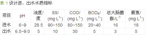 根據原水來源及出水水質要求,確定進、出水水質指標見表 1,設計處理水量為400 m3/d。