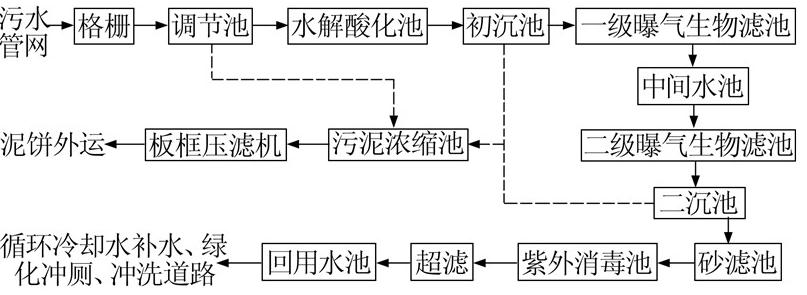 由于污水處理后主要供循環冷卻水系統補水,對水質要求較高。水解酸化工藝可提高污水的可生化性。曝氣生物濾池(BAF)集生物氧化、截留懸浮固體為一體,具有抗沖擊負荷能力強、污泥產量較少、出水水質穩定等特點〔1, 2〕。超濾在過濾微細懸浮物及膠體物質方面具有良好的效果〔3, 4〕,因此采用水解酸化—曝氣生物濾池—超濾組合工藝進行處理,工藝流程如圖 1所示。從流程上分為3個部分: 預處理工藝、生化處理工藝和深度處理工藝。其中生化處理工藝為水解酸化—兩級曝氣生物濾池工藝,深度處理工藝為超濾工藝。