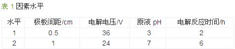 設計極板間距(A)、電解電壓(B)、原液pH(C)和電解反應時間(D)4因素3水平L9 (34)正交實驗表,如表 1所示,實驗結果列于表 2。