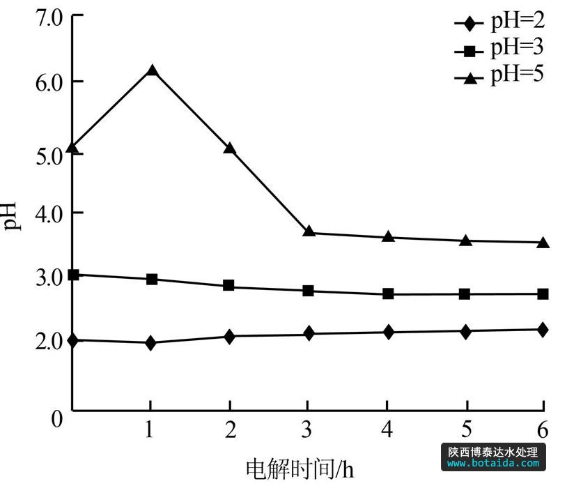 圖 3 初始pH為2、3、5時pH隨時間變化情況