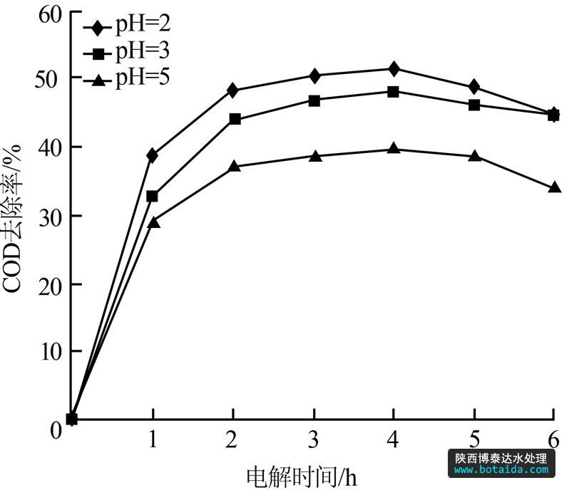 從圖 2來看,酸性條件下使用Ir-Ta-Sn摻雜電極更有利于滲濾液的降解,且酸性越強,COD去除率越大,最高可達50%;由圖 3可見,強酸性條件下體系pH變化不大,但弱酸性條件下pH有趨向酸性的趨勢,即在電解過程中有酸性物質產生,這對于電催化是有利的。