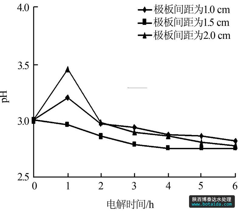 考慮到過高的電解電壓對電催化降解的影響不是很顯著,且由正交實驗結果可知,電解電壓為24 V、pH為3時COD去除率最高,因此調整電解電壓為24 V、垃圾滲濾液pH為3,分別設置極板間距為1.0、1.5、2.0 cm進行電催化降解實驗,每隔1 h取1次水樣,電解過程中COD去除率及pH變化情況如圖 5、圖 6所示。
