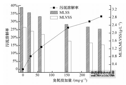 首先考察了不同臭氧投加量對污泥溶解率的影響.如圖 1所示,隨著臭氧投加量的增加,污泥的MLSS和MLVSS逐漸減小,污泥溶解率逐漸增大.當臭氧投加量在0~154 mg · g-1時,溶解率增加較快,由0增加到26%;當臭氧投加量在154~268 mg · g-1時,污泥溶解率增加較慢,由26%增加到33%.為了在獲得較好污泥減量效果的同時盡可能降低污泥臭氧處理的成本,建議合理的臭氧投加量為150 mg · g-1左右.