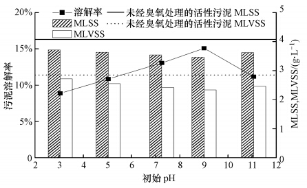 在污泥臭氧處理過程中,臭氧投加量和活性污泥的初始pH會影響污泥的溶解率及有機質、氮、磷等物質的溶出,從而影響污泥臭氧減量的效果.故合理的臭氧投加量和污泥初始pH不僅對污泥臭氧減量有利,而且可以提高工藝的經濟性.