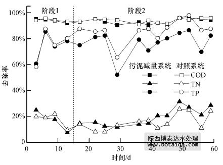 圖 5顯示了污泥減量系統和對照系統中COD、TN和TP的去除率.第一階段(前15 d),污泥減量系統和對照系統采用相同的運行方式,因此兩系統的COD、TN和TP去除率很接近.第二階段(后45 d),污泥減量系統啟動臭氧處理工藝,其COD、TN去除率與對照系統基本保持一致,而TP去除率明顯下降,其他學者的研究結果也證明了這一點(Lee et al., 2005;寇青青等,2012).在整個運行期間,兩系統出水COD在15~35 mg · L-1之間,去除率在90%以上;出水TN在50~60 mg · L-1之間,去除率約為20%.第二階段,污泥減量系統出水中NH3-N略有升高,NO-3-N約為30 mg · L-1,NO-2-N小于2 mg · L-1.