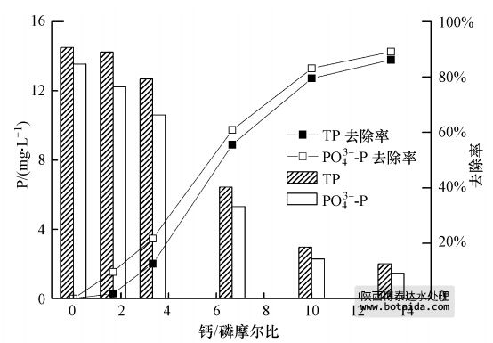 如前所述,當生物處理系統剩余污泥零排放時,出水中磷濃度將逐步升高,因此,需要增加除磷工藝,使出水TP達標.圖 7初步考察了鈣磷摩爾比對除磷效果的影響.由圖可知,隨著鈣磷摩爾比的增大,上清液中的TP和PO3-4-P逐漸降低,鈣磷摩爾比在3.3~10.0時,磷去除率增加較快,在0~3.3和10.0~13.3時,去除率增加較緩.鈣磷摩爾比在10.0以上時,TP和PO3-4-P的去除率均超過80%.