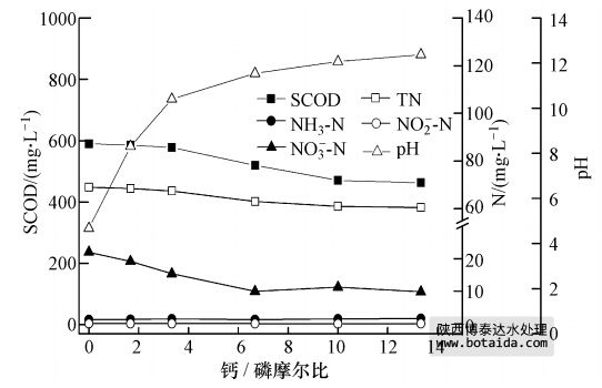 選用Ca(OH)2作為除磷劑,分別考察了不同鈣磷摩爾比(1.7、3.3、6.7、10.0、13.3)和對臭氧處理后污泥上清液的除磷效果以及SCOD、氮、pH的影響.