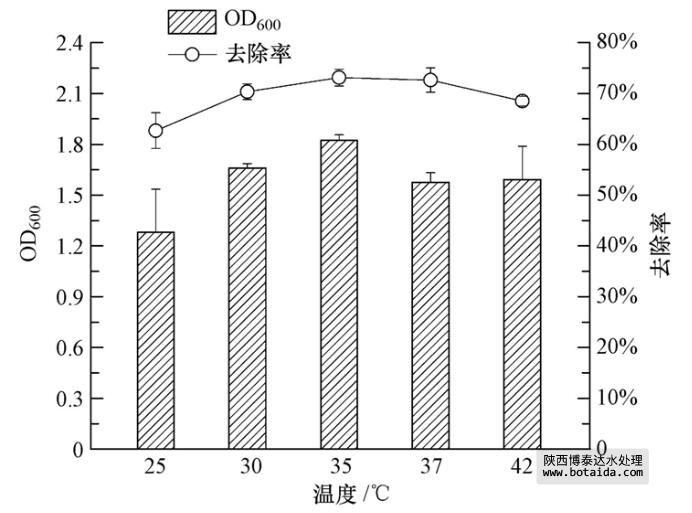 由圖 7可知,隨著溫度的升高,聚磷菌ED-12菌株的生物量也增大,35 ℃時最適宜ED-12菌株的生長. 相應地,ED-12菌株對PO3-4-P的去除率也呈先增后減的趨勢,在35 ℃時達到最大值(73.14%±1.65%). 由此可知,不同溫度對聚磷菌ED-12菌株除磷效果的影響比對其生長的影響大得多.溫度對聚磷效果存在影響,這與Panswad等(2003)的研究結果相符,即35 ℃最有利于聚磷菌發揮聚磷作用,過高或過低的溫度都會抑制其效果,說明不同的微生物聚磷特性存在差異.