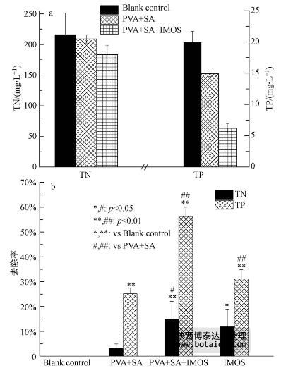 根據賴子尼等(2008)的實驗配方制備的固定化聚磷微生物小球的彈性與機械強度較好,對含氮磷廢水的凈化效果表明,菌球對磷有較強的去除能力(從(19.91±1.81)mg · L-1 降至(6.19±0.76)mg · L-1),同時能夠去除一定的氮(從(215.82±35.29)mg · L-1 降至(183.42±15.35)mg · L-1)(圖 10 a). 二者的去除率分別達56.21%和15.01%(圖 10 b). 其中,固定化材料對氮的吸附比例較小,而對磷的吸附較顯著(p<0.01),這可能與固定化材料的表面官能團及CaCl2等對PO3-4的親和力強于NO-3有關. 同時,固定化微生物(IMOs)對磷的去除效果也優于氮,說明菌株ED-12可能不具備反硝化能力,對氮的利用僅是生長所需. 由PVA+SA+IMOs組與PVA+SA組比較可知(圖 10b,#表示),無論是氮還是磷,都存在顯著差異,說明固定化微生物是氮磷去除的主要貢獻者.