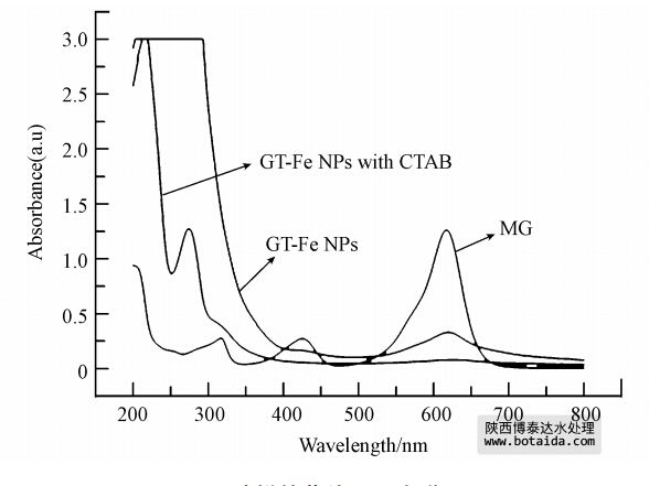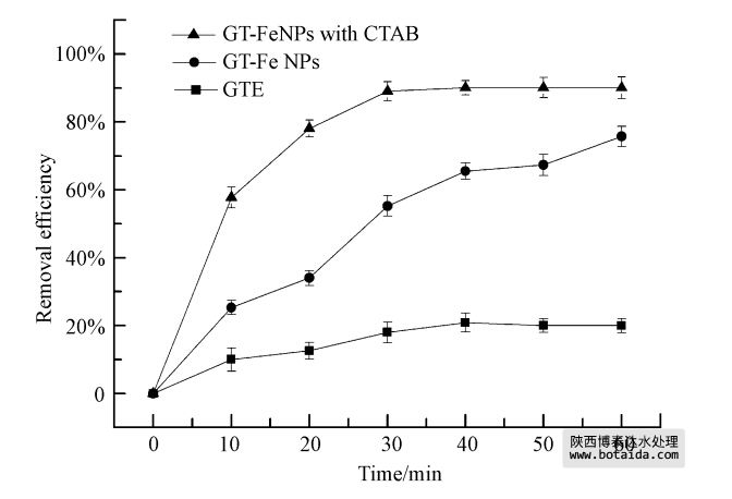 2)比較GTE、GTE合成的Fe NPs和CTAB作用下GTE合成的Fe NPs對MG的去除效果發現,GTE對MG有一定的去除作用,30 min達到平衡時,去除率為20.03%;GTE合成的Fe NPs對MG的去除效率30 min為52.28%,反應平衡時達到75.66%;而CTAB作用下GTE合成的Fe NPs對MG的去除效率更大,30 min就達到了77.78%,反應達到平衡高達91.06%. Fe NPs是去除MG的主要物質.