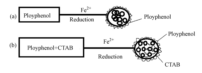 用植物提取液合成納米金屬主要是通過植物提取液中的有機成分如多酚等為還原劑還原金屬鹽,GTE中多酚可作為還原劑還原亞鐵鹽制備Fe NPs(Njagi et al., 2011; Shahwan et al., 2011; Kharissova et al., 2013; Mittal et al., 2013). GTE合成Fe NPs和CTAB作用下GTE合成Fe NPs可能的機理如圖 6所示. 陽離子表面活性劑CTAB存在時,由于CTAB吸附在納米顆粒表面導致納米鐵帶電荷,納米顆粒之間的斥力作用使得合成的納米顆粒更加分散,從SEM、XRD、FTIR和UV-vis等的表征結果也可證實CTAB的包覆使得合成的納米鐵更加穩定.