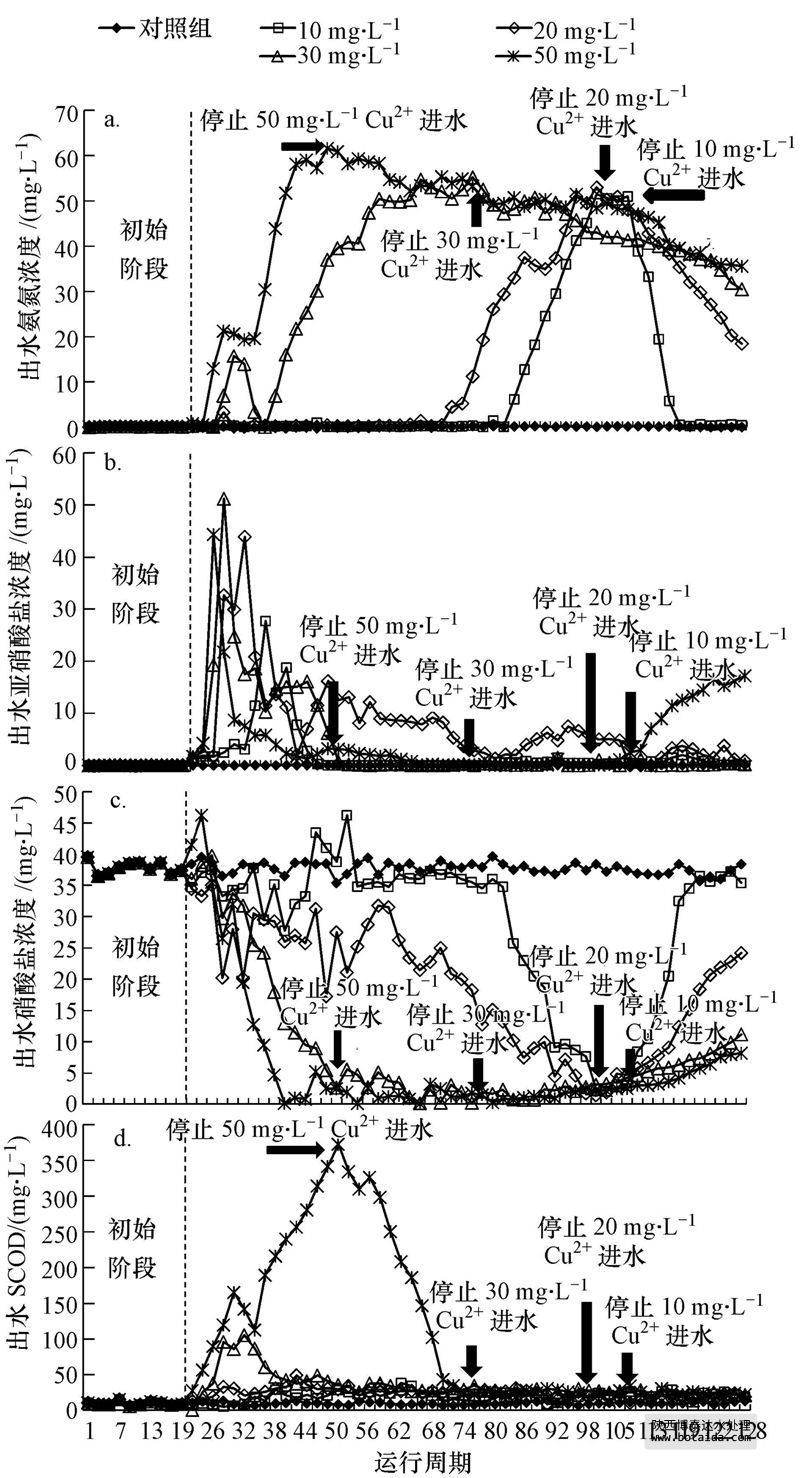 試驗采用5個相同的SBR反應器進行持續負荷試驗.其中1個反應器為對照體系,進水始終為不含Cu2+的模擬污水.另外4個反應器在第1~20周期內的進水為不含Cu2+的模擬污水,該階段為初始階段;第21周期后,4個反應器的進水變為含Cu2+濃度分別為10、20、30和50 mg · L-1的模擬污水,該階段為抑制階段;當各反應器的出水NH+4-N保持穩定后,停止向進水中加Cu2+,系統進入恢復階段.
