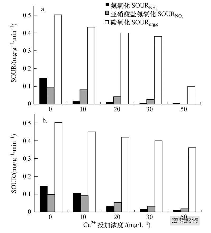 圖 4 Cu2+投加濃度對SOUR的影響(a.抑制穩定期SOUR;b.恢復末期SOUR)