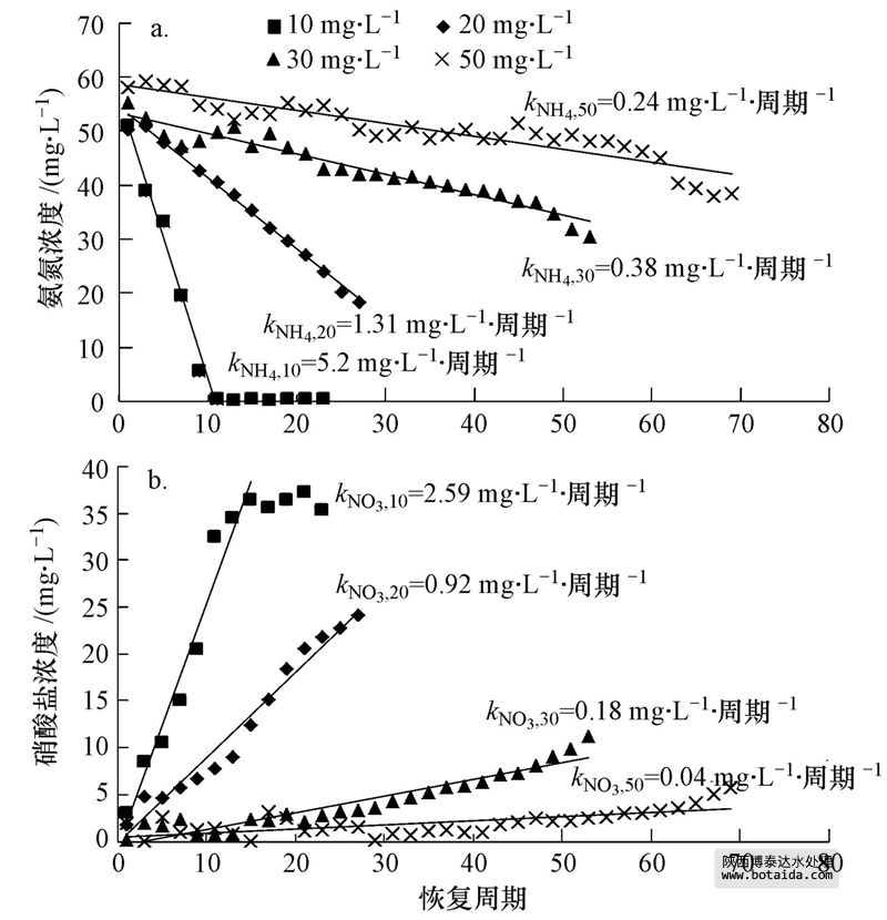 式中,CNH4是出水中NH+4-N濃度(mg · L-1),CNO3是出水中NO-3-N濃度(mg · L-1),t是周期數,kNH4為恢復期NH+4-N的消耗速率(mg · L-1· 周期-1),kNO3為恢復期NO-3-N的生成速率(mg · L-1· 周期-1).