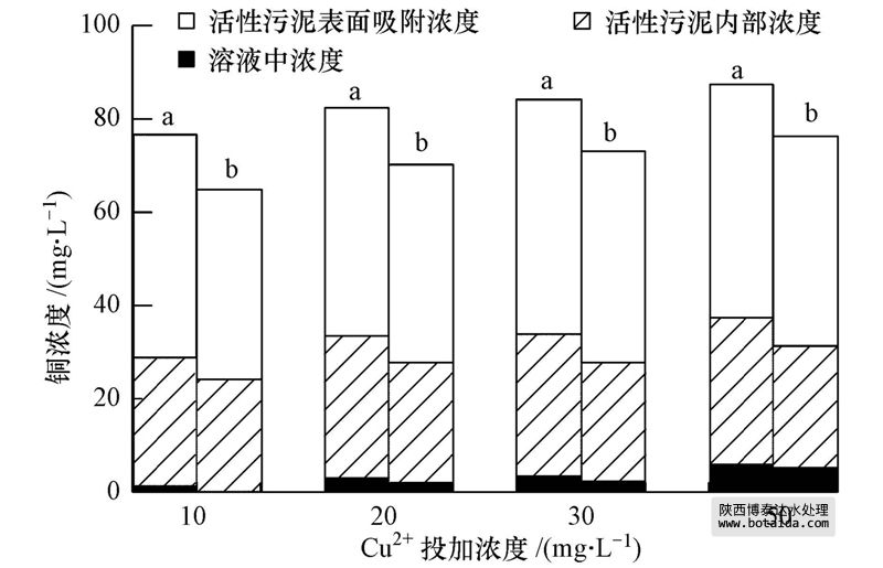 反應器體系內的總銅、溶解態銅、活性污泥內部的銅、活性污泥表面吸附的銅可以反映銅在體系內的分布,結合硝化作用的抑制可分析出銅對硝化細菌的影響.測定活性污泥內部的銅主要運用洗脫液(1 mmol · L-1 EDTA,pH=7.0,0.1 mol · L-1 NaCl)洗脫泥樣后測定的方法.洗脫液使活性污泥表面吸附的銅解吸附,洗脫后殘留在泥樣內的銅被認為是進入細胞內部的銅.將用洗脫液洗脫后的泥樣、過濾后的水樣、泥水混合樣加酸進行微波消解后,用火焰原子吸收儀測定銅的濃度,分別得到活性污泥內部的銅、溶解態銅、總銅含量.總銅減去溶解態銅和活性污泥內部的銅后可得到活性污泥表面吸附的銅.