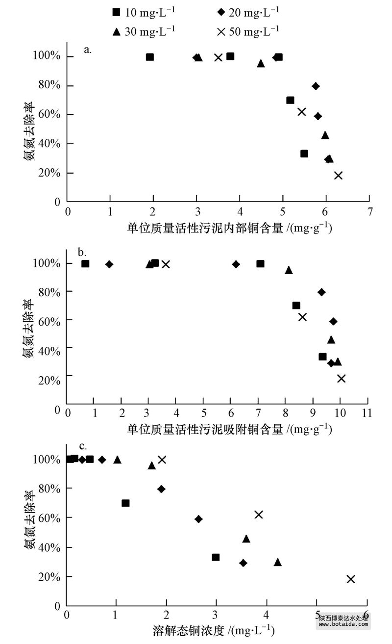 圖 6 不同形態的銅和氨氮去除率的相關性(a.活性污泥內部的銅;b.活性污泥吸附的銅;c.溶解態的銅)