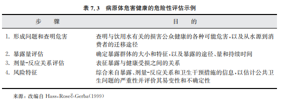 風險評估、包括QMRA,首先從提出問題開始,其目的是確定各種可能的危害及危 害從源頭到消費者的各種遷移路徑。然后,將人接觸病原體的情況(環境濃度及攝入 量)和所選(或參考)生物體的劑量 反應關系綜合起來以描繪出風險的特征。結合其他 信息(社會、文化、政治、經濟、環境等)就可提出一些優先選用的管理辦法。為鼓勵利 益相關各方的支持和參與,在處理過程的每一階段,都能做到透明并主動溝通有關危險 性的信息是非常重要的。表7.3給出了危險性評估的一個例子并在下面進行詳細 描述。