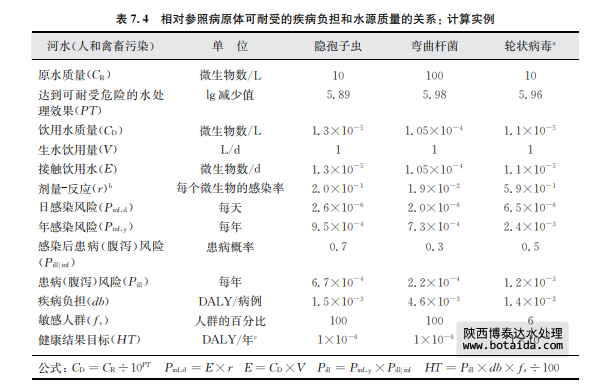 當需將一個病例中發生特定疾病的風險轉化為疾病負擔時,可以使用DALY(metric disabilityadjustedlifeyear)(見第3章3.1)。這不但反映了急性終點反應(腹瀉),也反映了 死亡率和更嚴重的終點反應(如與彎曲桿菌有關的格林 巴利綜合癥,即急性感染性多發神 經炎)。每個病例的疾病負擔變化很大。例如,每1000例輪狀病毒的疾病負擔在低收入地 區為480DALYs,而且還經常發生兒童死亡。但在大多數居民都能得到醫療救助的高收入 地區僅為14DALYs/1000例(見附錄1支持性文件《世界衛生組織飲用水水質準則中公共 衛生風險量化》)。由于這種疾病負擔上的明顯差別,為了要達到相同的危險程度(以 DALYs/人/年表示),在相同水源質量的情況下,在低收入地區就需要實施更嚴格的水處 理。表7.4中10-6DALY/人/年這樣的健康結果目標最好能與具體國情相結合。表7.4中 沒有免疫缺陷人群的計算數值(如 HIV/AIDS患者中的隱孢子蟲病),在某些國家,這些人群的數量還是很多的。3.2節中有更多關于DALY的信息,及關于如何將其用于獲取風險 參考值。