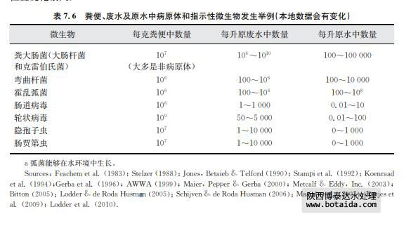 表7.6中基于對實際數據的評估為確定在各種受糞便污染影響的水源中的腸道病原體濃 度提供了一個有用的參考。然而,這些數據也有很多限制性和不確定性,包括以下幾個方面: