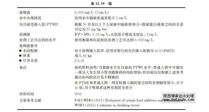 鎘化合物的吸收取決于它們的溶解度。鎘主要在腎臟蓄積,在人體的生物半衰期長達 10~35年。有證據表明,鎘能夠通過吸入途徑致癌。IARC將鎘及鎘的化合物列入2A組 (對人類很可能(probably)是致癌物)。不過,目前沒有鎘經口途徑致癌的證據,鎘的遺傳毒 性也沒有明確的研究。腎臟是鎘毒性的主要靶器官。 在對鎘最近的評估中,JECFA相關報告表明,50歲及以上個人的尿液中生物標志物β2 微球蛋白的排泄數據可用于確定尿液中鎘的臨界濃度。每克肌酸酐含量小于5.24μg鎘的 尿液與β2 微球蛋白的增加排泄不相關,導致尿鎘濃度為5.24μg/g肌酸酐的食物攝取量估 計為每天0.8μg/kgbw或約每月25μg/kgbw。由于鎘的超長生物代謝半衰期,暫定 犘犜犕犐值為25μg/kgbw,取代了之前設定犘犜犠犐的7μg/kgbw。