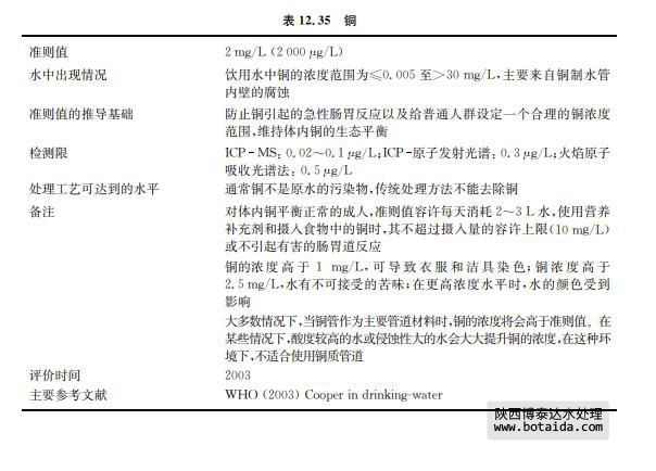 IPCS相關研究資料表明成人經口攝入的銅濃度可接受范圍的上限是不確定的,但是 成人攝入量通常范圍是數毫克每天(每天大于2或3mg),而不是更多的量。銅不良效應 的評估僅依據攝入含銅污染的水后腸胃道所起的不良效應。目前有關研究的毒理學資料 建立在實驗動物的基礎上,不能適用于人類的情況,不能用于確定銅濃度可接受范圍的上 限,但有助于確定不良反應的作用方式。由于觀察到的腸胃道反應受到消化道內濃度較 高(比24h的攝入量還要高)銅干擾,銅導致腸胃道反應的研究結果必須謹慎使用。近 期的研究描述了引起腸胃道反應的飲用水中銅的閾值,但仍存在銅對敏感人群長期效 應的不確定性,例如,具有 Wilson病(肝豆狀核變性)基因和其他體內銅平衡代謝障礙 的人群。