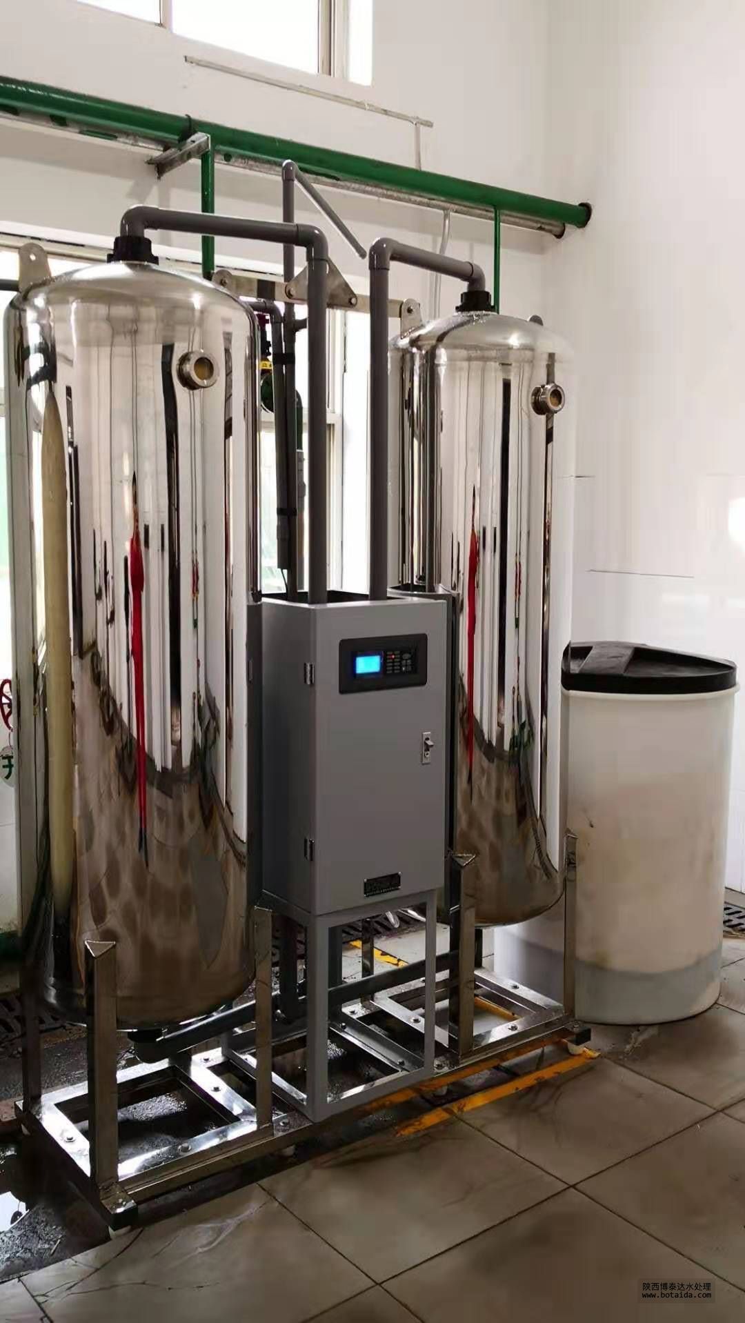 原水通過交換器時水中的鈣、鎂離子與樹脂交換柱中的鈉離子進行離子交換反應,去除原水中的鈣、鎂離子,從而使原水得到軟化。當設備運行一段時間后,鈉離子交換器中的樹脂用鹽溶液進行再生,經再生處理后的樹脂,樹脂又重新恢復交換能力,又可繼續進行軟化處理,兩個交換罐交替進行再生、置換、清洗、運行,連續產水,自動循環。