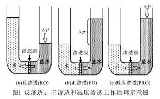正滲透膜技術屬于膜分離過程。水從高水化學勢區通過選擇性滲透膜向低水化學勢區進行轉移。選擇性滲透膜分隔的高水化學勢區和低水化學勢區所存在的滲透壓差是正滲透過程的驅動力。正滲透技術具有低能耗、較高的水通量和回收率、不易結垢和可處理高濃鹽水等優點。