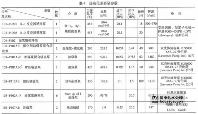 表4列出了煤液化主要泵參數,這些泵當時都是從國外進口的,現在有些已能國產,但還是有不少位號的泵需要通過技術攻關才能實現國產化。