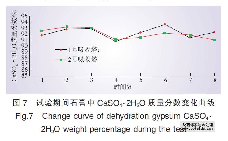 由圖3—7可以看出, 試驗期間, 雖然混入處理后的工業廢水量不斷加大, 但脫硫系統漿液密度均能維持在1 130 kg/m3左右, 且脫硫效率仍然大于或等于95%; 脫硫副產品石膏品質未發生明顯變化, 石膏的含水率基本保持在10%, 石膏中CaCO3質量分數小于3%, CaSO4· 2H2O純度大于90%, 符合商用石膏品質要求。此外, 試驗期間除霧器壓差處于正常運行范圍之內, 吸收塔沒有發生起泡、堵塞等不正常現象。試驗結果表明, 處理后的工業廢水可用作脫硫工藝水。