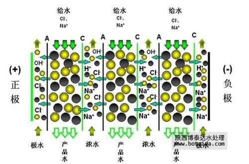 帶負電荷的陰離子(例如OH-、Cl-)被正極(+)吸引而通過陰離子交換膜,進入到鄰近的濃水室。此后這些離子在繼續向正極遷移中遇到鄰近的陽離子交換膜,而陽離子交換膜不允許陰離子通過,這些離子即被阻隔在濃水中。淡水流中的陽離子(例如Na+ 、H+)以類似的方式被阻隔在濃水室。在濃水室,透過陰陽膜的離子維持電中性。