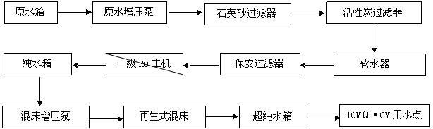 6、原水箱→原水增壓泵→石英砂過濾器→活性碳過濾器→軟水器→保安過濾器→反滲透系統→純水箱→混床增壓泵→超純水箱→10MΩ.CM用水點