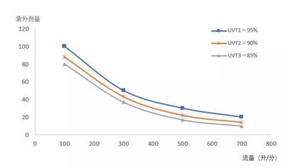 生物驗證是通過向紫外線消毒系統加入目標微生物,測定目標微生物的滅活率,反推紫外設備的劑量及消毒性能的。首先,用紫外平行光儀均勻照射已知濃度的目標微生物樣品,檢測照射后微生物濃度以確定滅活率。根據紫外強度、暴光時間等試驗因素,計算微生物的紫外線照射劑量,最終得到目標微生物的紫外線劑量-滅活率曲線。然后,進行紫外線反應器的測試,將驗證微生物加入到紫外線消毒系統的上游,在確定流量、UVT、UV功率等條件下,測定目標微生物的滅活率。根據檢測結果以及上述紫外線劑量-滅活率曲線,可得在不同紫外燈輸出功率和不同紫外線穿透率條件下,紫外線水消毒設備處理流量-劑量關系曲線,如圖1所示。圖1中UVT為水體紫外穿透率,橫坐標為設備所處理的流量,縱坐標為設備的實際劑量。