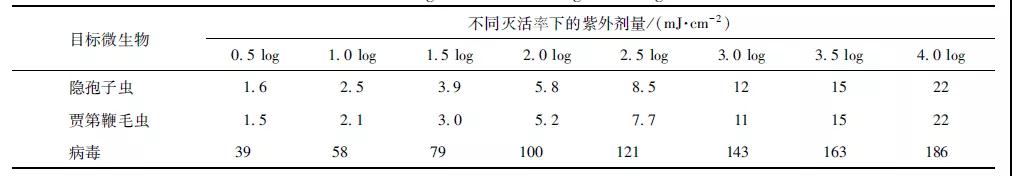 不同的微生物需要不同劑量的紫外線來滅活。因此,對于任何紫外線系統,必須清楚需要滅活的微生物。表2介紹了滅活不同病原微生物所需的紫外線劑量。例如,要滅活99%(2 log)的隱孢子蟲需要5.8 mJ/cm2。要滅活99.99%(4 log)需要22 mJ/cm2。