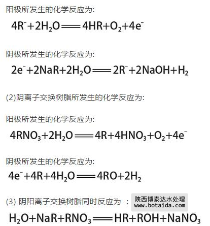 在利用滲析的極化過程中,由于在水溶液中會產生H+和OH-,使樹脂在化學反應中進行電化學再生,這對水質的提升具有正面的影響,而在再生的過程中,如果不進行離子交換處理,就會造成水質變壞,這樣就需要采用適宜的工作環境,才能達到提高水質的要求,采用EDI裝置的離子交換樹脂技術,可以有效的提高水質。具體的化學反應方程式如下,