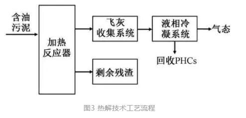 在無氧條件下,含油污泥經高溫熱解轉化為氣、液、固三相,氣相產品以CH4、CO2、H2和CO為主,液相一般為常溫燃油和水,固相殘渣中含有焦炭,一般以回收液態PHCs為主,可不調質達到回收目的。熱解反應在還原氣氛下進行,產二噁英極少,其典型工藝流程如圖3所示。