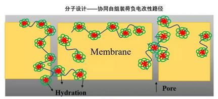通過分子設計,采用雙荷負電(兩親)嵌段共聚物自組裝形成的豐富而有序的拓撲結構,對常規UF膜進行協同自組裝荷負電改性,最終制得高度有序的不對稱均孔荷負電功能超濾膜。